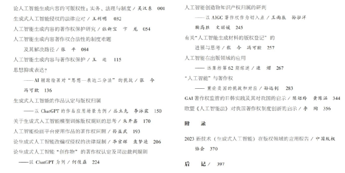 本书得到了吴汉东、王利明、张新宝、张平、王迁、张今、丛立先、孙远钊等多位著名学者、教授的大力支持。本书收入了17篇文章并附上中国版权协会《2023新技术(生成式人工智能)在版权领域的应用报告》,反映了当前国内在版权领域研究生成式人工智能的最高水准与最新进展,也为人工智能的立法、司法、学术研究、教学与应用提供了权威的可资借鉴的观点与分析。